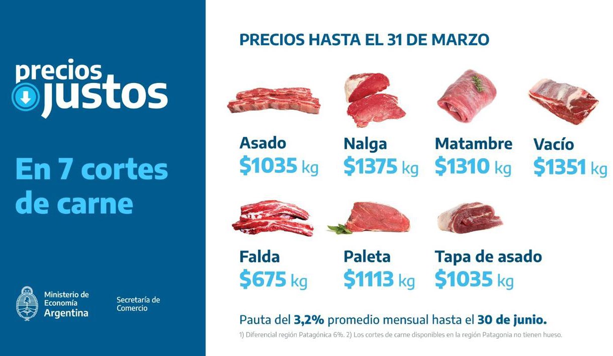 Entre las medidas orientadas a los consumidores, la Secretaría de Comercio lanzó Precios Justos Carne para 7 cortes populares. El precio por kilo, que entrará en vigencia el 17 de febrero y mantendrá sus precios hasta el 31 de marzo, para los cortes es: tira de asado $1035, nalga $1375, matambre $1310, vacío $1351, falda $675, paleta $1113 y tapa de asado $1035.