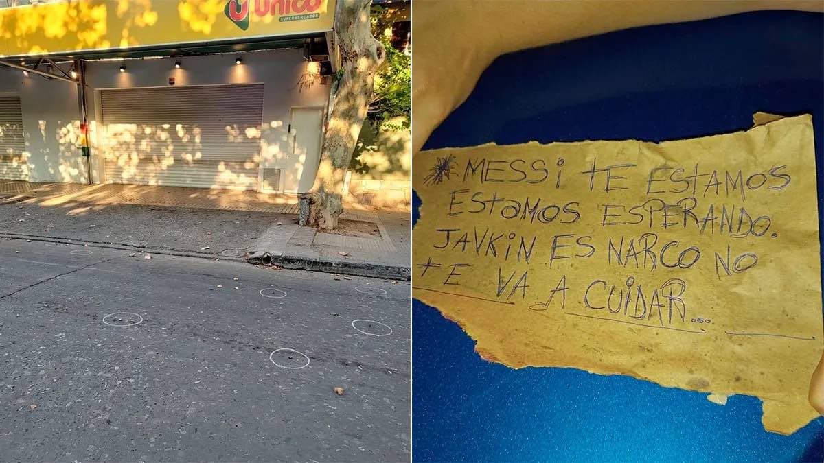 Un supermercado de la cadena Único, que pertenece a la familia de Antonela Roccuzzo, pareja de Lionel Messi, fue atacado a tiros a las 3:20 de este jueves sobre la calle Lavalle, en la zona oeste de Rosario. En la puerta del local, el Comando Radioeléctrico de la Policía provincial encontró un mensaje dirigido al capitán de la selección argentina. “Messi, te estamos esperando. Javkin también es narco, no te va a cuidar”, dice el texto escrito con birome en un cartón, en referencia también al intendente rosarino.